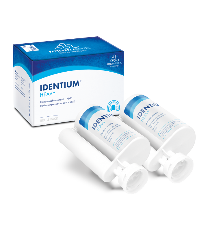 Identium Heavy ist ein zähfließendes Präzisionsabformmaterial aus Vinylsiloxanether, das aufgrund seines optimalen Druckaufbaus in Kombination mit Identium Light besonders gute Ergebnisse in der Doppelmischtechnik liefert. Es ist in zwei Varianten erhältlich: